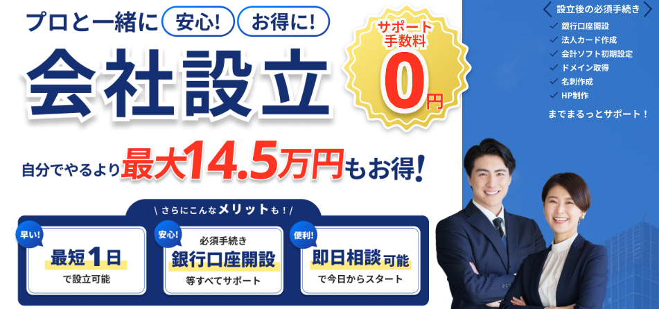 自分で会社設立を進める場合と比較して最大14.5万円お得になるケースもあり、さらに書類作成や手続きに迷うことなく、専門家と伴走しながら安心して法人化を進められます。