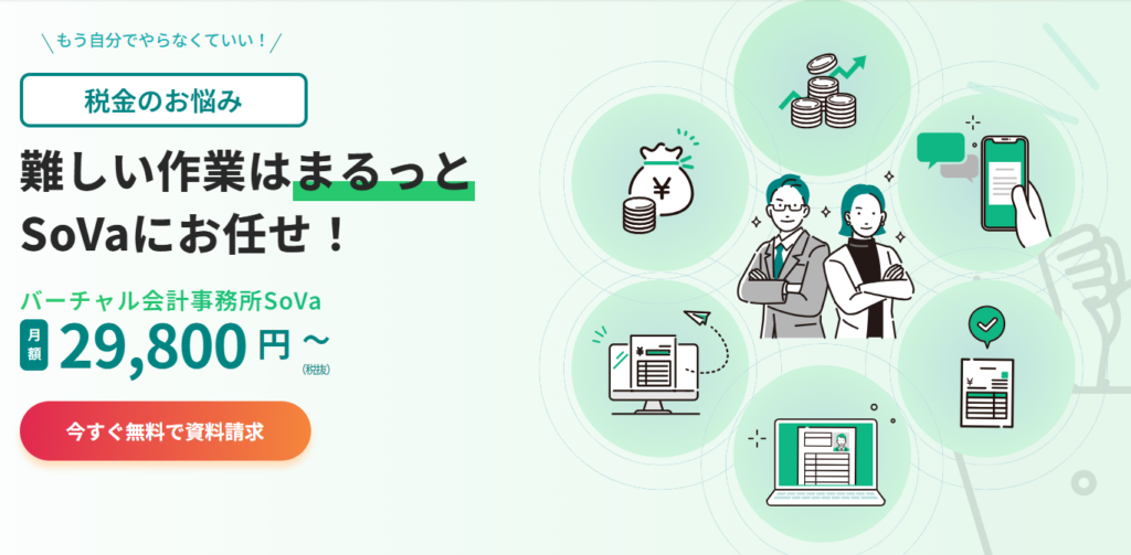 会計事務所SoVaでは、記帳業務や給与計算だけではなく、社会保険などの役所手続き、さらには助成金・補助金や節税アドバイスを29,800円〜丸ごとお任せいただくことが可能です。バックオフィス業務が面倒だと感じている方は、ぜひ会計事務所SoVaにお任せください!